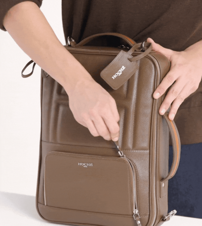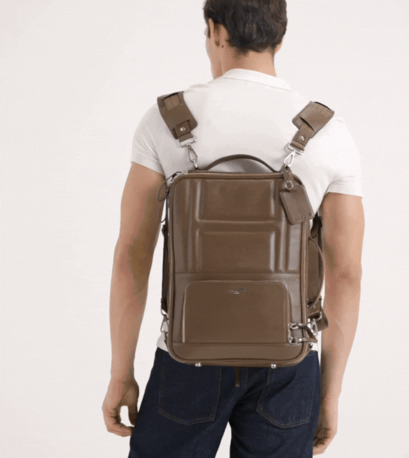 Dual faced proprietary design with versatile 3-in-1 carrying styles: wear it as a backpack, messenger, or briefcase. Rust free Metal feet are attached for base leather protection.